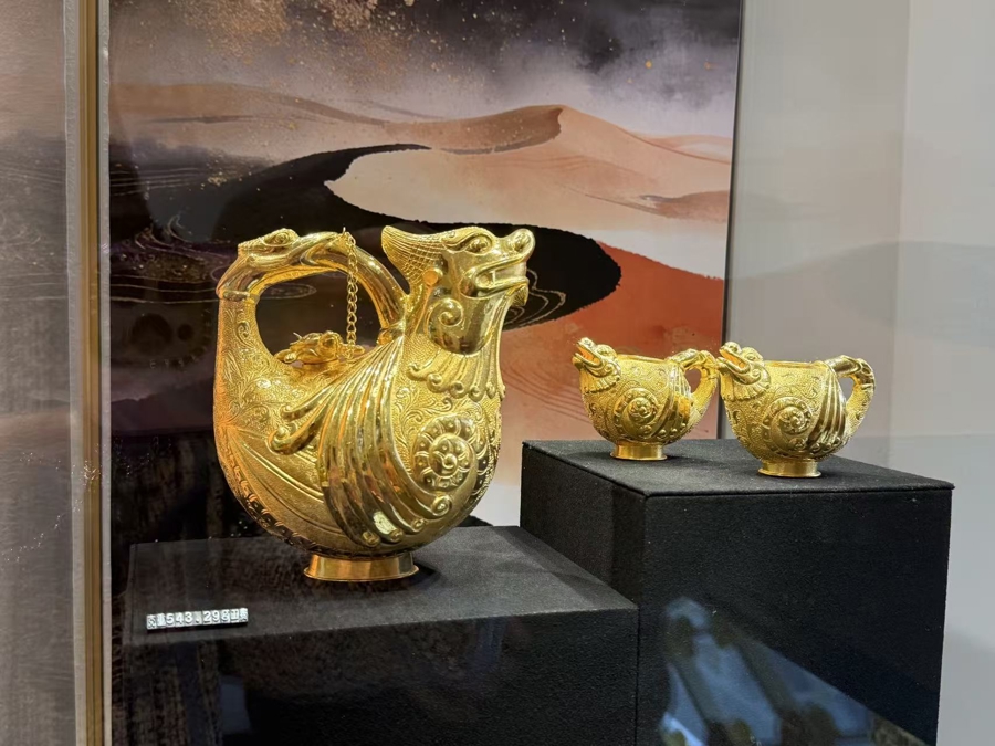 老铺黄金在恒隆广场展出“十二月花神漆器螺钿金杯”。受访者供图