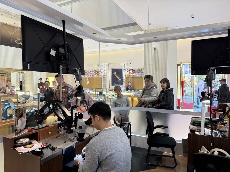 为让更多东说念主恍悟密致黄金饰品背后的匠心传承,本年1月1日起,老凤祥在豫园旗舰店越过树立金银细工高端定制工坊。工坊以通透玻璃围合而成,墙面胪列着丰富的制作器用;操作台同步畅达外部流露屏,及时呈现制作全历程,让顾主直不雅见证一件件饰品若何经由工匠的非遗工夫尽心砥砺,最终无缺呈现。