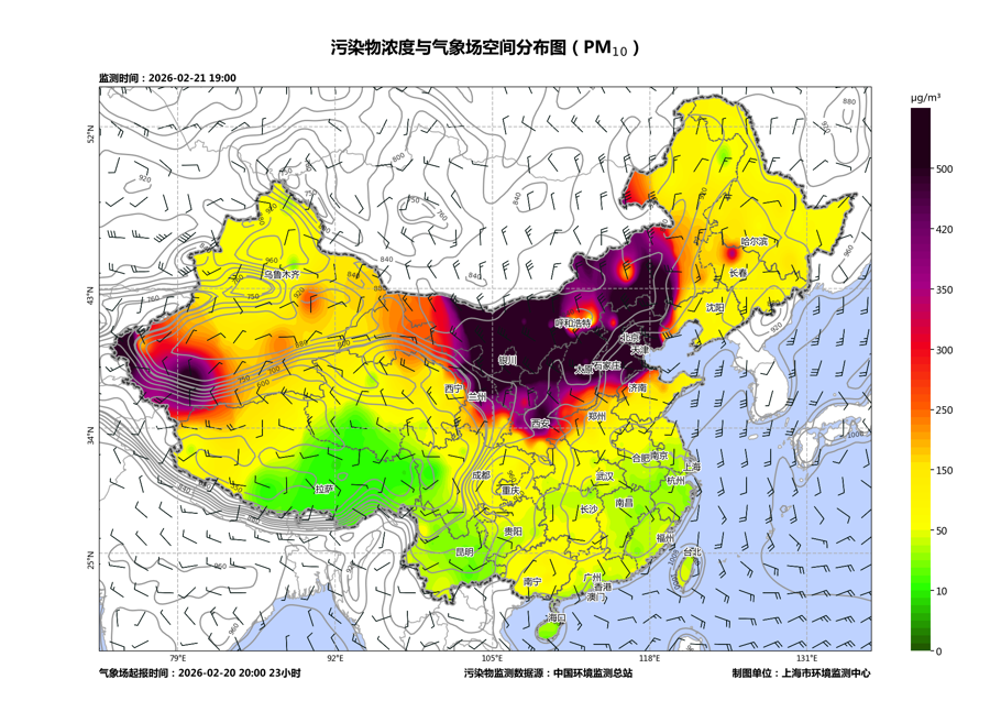 2月21日19时世界PM10浓度空间散布。 开始:上海市环境监测中心
