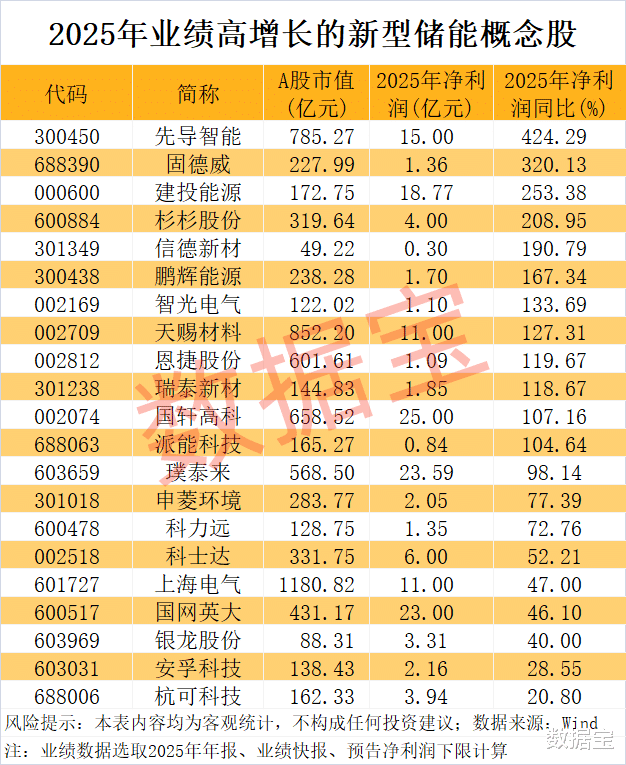 字据现在清楚的2025年年报、事迹快报、预报净利润下限(若无下限则取公告数值)策画,2025年净利润同比增长20%以上(含扭亏为盈)的新式储能成见股有21只。6股净利润扭亏为盈,区分为恩捷股份、杉杉股份、智光电气、鹏辉能源、固德威、信德新材。